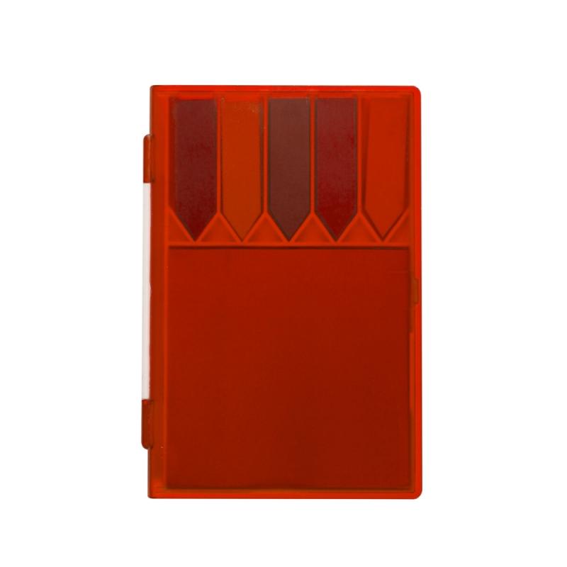 Bloco de anotações plástico com autoadesivos, capa colorida e base branca. Possui cinco bloquinhos autoadesivos com aproximadamente 50 folhas cada e um bloco maior com folhas amarelas sem pauta, aproximadamente 50 folhas.