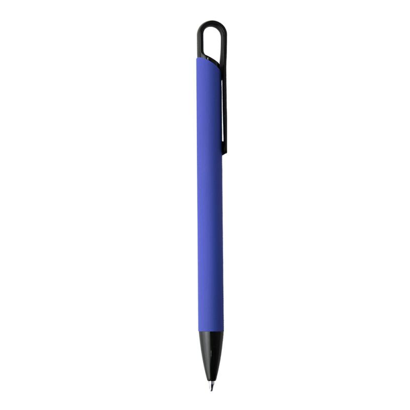 Caneta semimetálica com acabamento emborrachado, acionamento por clique e carga esferográfica azul 1.0mm.